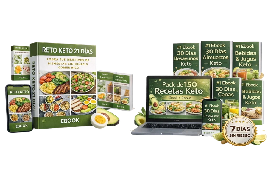 Accede AHORA y Descarga tus recetas, antes que ya no esté disponible esta oportunidad TE LLEVAS 2 PRODUCTOS TU RETO KETO DE 21 DÍAS MÁS UN PACK DE 150 RECETAS KETO FÁCILES.